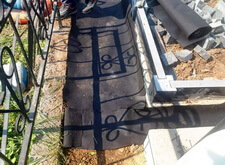 Подготавливаем территорию вокруг места захоронения к покрытию брусчаткой: ввариваем металлическую полосу и укрываем землю геотекстилем.