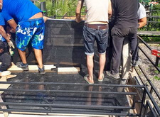 Устанавливаем надгробья. Справа располагается старый гранитный памятник, слева – композиция, изготовленная из полимеров. Скульптуры предоставлены клиентом и были сделаны в другой мастерской, сами они лёгкие, по текстуре и цвету похожи на камень.